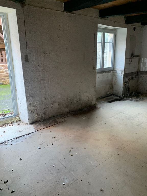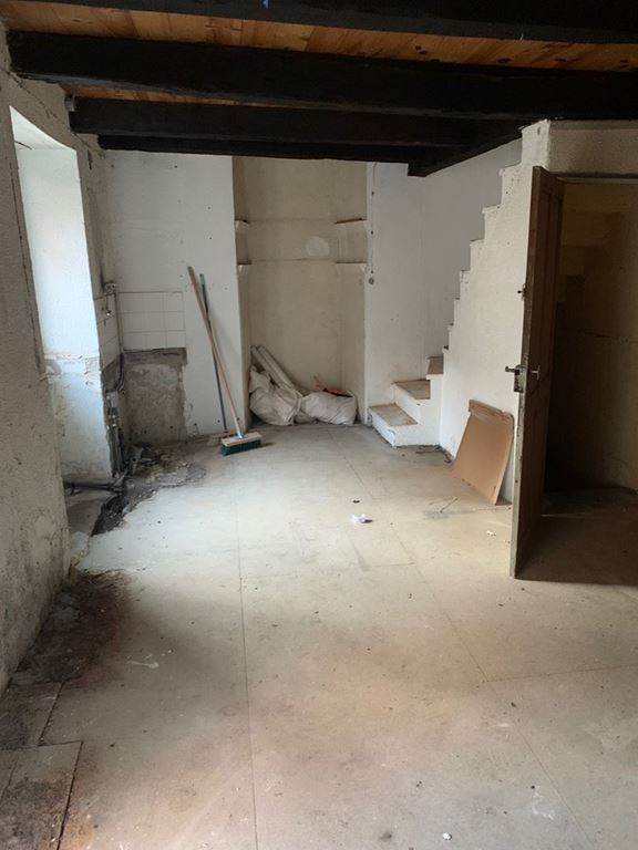 Au RDC : une pièce de vie avec un conduit de cheminée et l'accès à une petite pièce en sous-sol où se trouvait la salle d'eau (il ne reste plus que les évacuations.