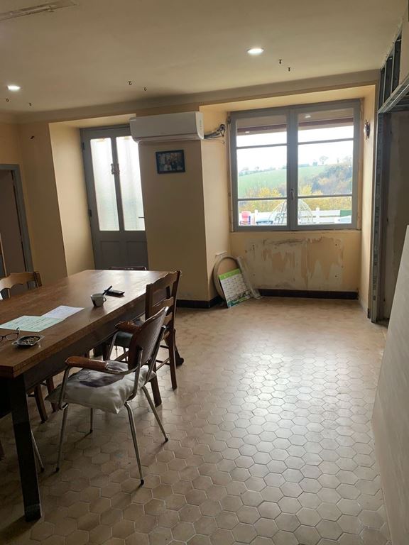 Une entrée de 2m2 donne accès d'un côté à une grange, de l'autre à la salle à manger de 23,50m2 ouverte sur un salon de 18m2 avec insert, et ouverte sur une terrasse de 77m2 avec belle vue sans vis à vis sur la campagne environnante. Une cuisine indépendante de 12m2 et une salle d'eau de 3,50m2 (douche, WC).